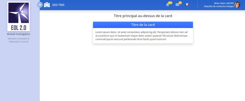 Dans cet exemple, tout ce qui se trouve dans <div id= »template »> sera placé dans un cadre ombré ayant un entête sur fond primary (de Bootstrap). Le «Lorem Ipsum» de cet exemple apparaîtra donc dans ce cadre, comme ceci :